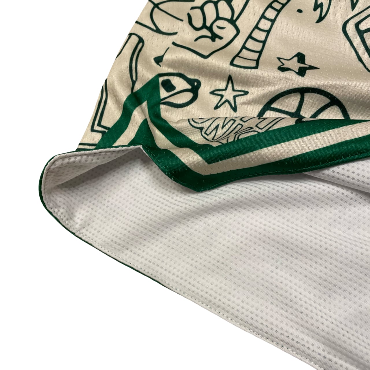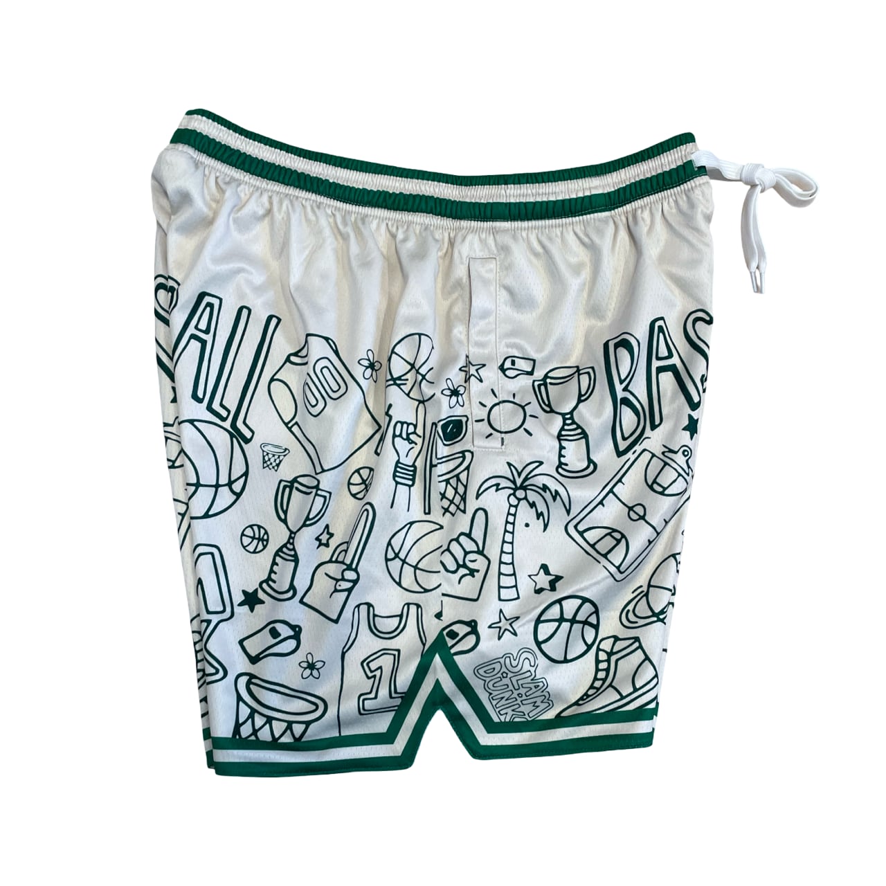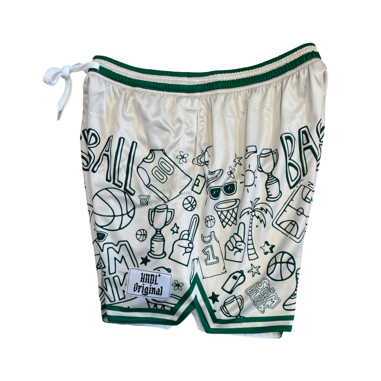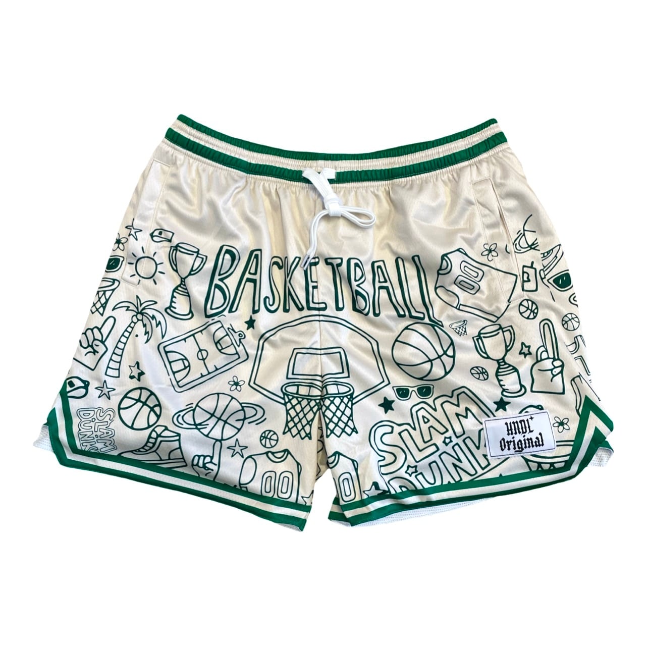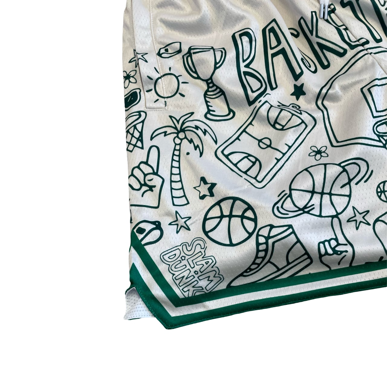落書きみたいなバスケモチーフを、クリーム×グリーンでまとめた遊び心全開の一本。